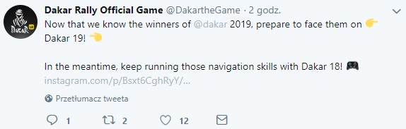 Informacja pojawiła się na oficjalnym profilu gry na Twitterze. Twórcy informują, że znamy już zwycięzców tegorocznej edycji rajdu dlatego gracze mogą się szykować na rywalizację z nimi w kolejnej części gry – DAKAR 19.