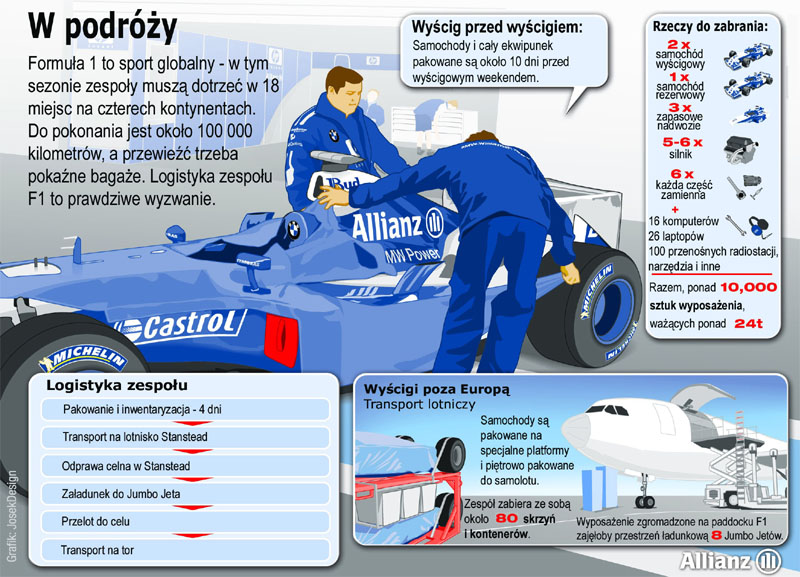 W podróży: Formuła 1 odwiedza 18 torów na czterech kontynentach. Zespoły pokonują około 100 000 kilometrów w tym sezonie – a ich bagaże nie należą do najlżejszych. Zespół Williams przewozi na wyścig poza Europą około 24 tony ekwipunku, kolejne 6 ton zabiera ze sobą dostawca silników, BMW. Na wyścigi europejskie te liczby są większe o kilka ton. Zabiera się więcej urządzeń – ciężarówki transportowe w czasie wyścigu funkcjonują jako wyspecjalizowane warsztaty, dzięki czemu z samochodami można zrobić praktycznie wszystko podczas weekendu Grand Prix.